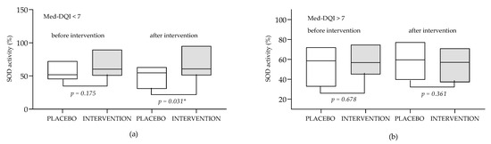 SOD activity in the subgroups of patients with Med-DQI < 7 (a) and Med-DQI > 7 (b) before and after ALA supplementation. Data are presented as medians (min to max values). Tested by Mann–Whitney test. * The observed difference is statistically significant (p < 0.05). SOD—superoxide dismutase activity; Med-DQI—Mediterranean Diet Quality Index.