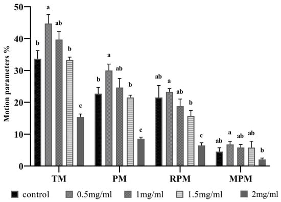 Effects of different concentrations of myo-inositol on sperm motility parameters after the freezing–thawing process. Control: 0 mg/mL, 0.5 mg/mL, 1 mg/mL, 1.5 mg/mL, and 2 mg/mL myo-inositol-treated groups; TM: total motility; PM: progressive motility; RPM: rapid progressive motility; MPM: medium progressive motility. Letters a, b, and c represent significant differences between groups (p < 0.05). Error bars show the SEM.