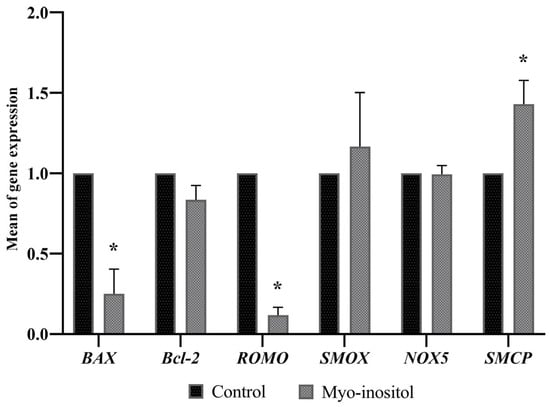 Effect of myo-inositol on gene expression after the freezing–thawing process. Control: 0 mg/mL myo-inositol; myo-inositol: 0.5 mg/mL myo-inositol. (*) Indicates a significant difference between the groups (p < 0.05). Error bars show the SEM. BAX: Bcl-2-associated X protein; Bcl-2: Bcl-2 apoptosis regulator; ROMO1: reactive oxygen species modulator 1; SMOX: spermine oxidase; NOX5: NADPH oxidase 5; SMCP: sperm mitochondria associated cysteine rich protein.