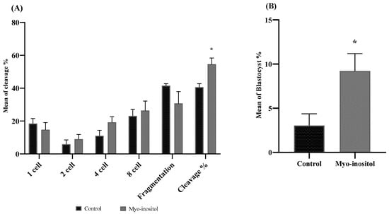 (A) Effect of myo-inositol-treated cryopreserved semen on the cleavage rate. (B) Effect of myo-inositol-treated cryopreserved semen on the blastocyst rate. Control: 0 mg/mL myo-inositol; myo-inositol: 0.5 mg/mL myo-inositol. (*) Indicates a significant difference between the groups (p < 0.05). Error bars show the SEM.