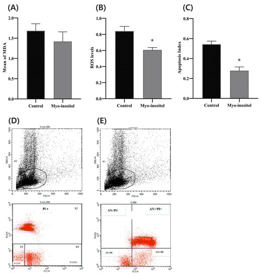 Oxidative stress was evaluated using the reactive oxygen levels shown in Figure 5B,D. The results showed that the myo-inositol-treated group had significantly lower ROS levels than the control group.