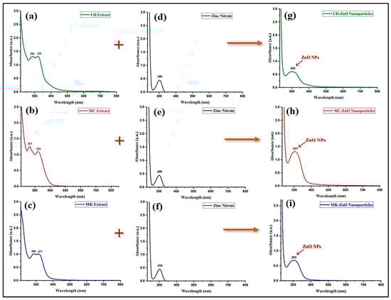 UV–Visible spectra of zinc nitrate (d–f), U. dioica (UD), M. chamomilla (MC), and M. koenigii (MK) extracts (a–c) and their respective phytofabricated ZnO-NPs (g–i). + represents addition of plant extracts into zinc nitrate solution and → represents synthesis of zinc oxide nanoparticles.