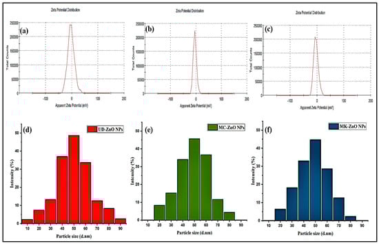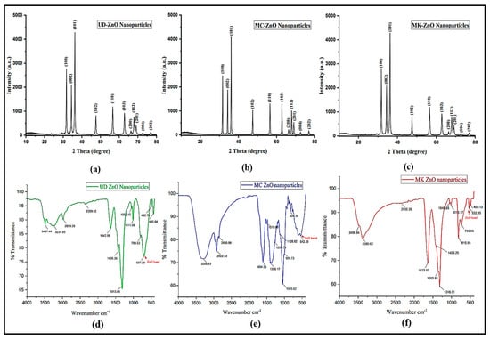 To determine the crystallinity of green-fabricated ZnO-NPs, X-ray diffraction (XRD) was used. ZnO-NPs were subjected to intense XRD rays during the analysis, and these rays passed through the material to reveal information about its physical properties, chemical composition, and crystallographic structure. The diffraction peaks were obtained for 2θ values at 31.7, 34.5, 36.4, 47.8, 56.2, 62.5, 66.2, 67.6, 69.1, 72.9, and 77.2, corresponding to the plane of reflections for the values of (100), (002), (101), (102), (110), (103), (200), (112), (201), (004), and (202), respectively. The results exhibited distinct, strong peaks, which denoted that the green-engineered ZnO nanoparticles are pure and crystalline. The high intensity peak of ZnO-NPs is identified as the characteristic peak of UD-ZnO, MC-ZnO, and MK-ZnO NPs from the XRD pattern (Figure 4a–c) at 101 planes after comparison with the standard powder diffraction card of the JCPDS “Joint Committee on Powder Diffraction Standards”. The purity of the biogenic ZnO-NPs is confirmed since no further diffraction peaks were detected.