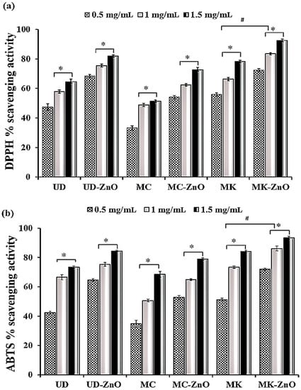 where Asample is the absorbance of biosynthesized ZnO-NPs from UD, MC, and MK, as well as their extracts, and Acontrol is the absorbance of ABTS stock solution.