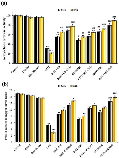 Third instar Drosophila larvae from the DMSO, control (untreated/normal), ROT, and ROT with biosynthesized ZnO-NP-treated groups were dissected and homogenized in ice-cold phosphate buffer (pH 7.4, 0.1 M) with KCl (0.15 M) to generate 10% homogenate/cytosol. Samples were homogenized and then centrifuged (10,000× g) for 10 min at 4 °C. The supernatant was filtered using a nylon mesh sieve with particles no larger than 10 mm, and it was then employed in a number of experiments [].