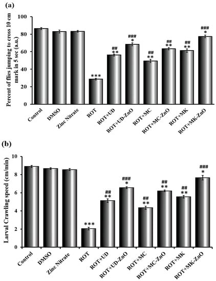 The flies/larvae (third instar) of D. melanogaster were segregated into 6 groups for the experiment. Group I received the standard Drosophila larval diet as a control, while Group II received food that had been combined with DMSO (0.1% vehicular control). In Group III, 500 µM ROT was used alone. UD-ZnO (0.1%), MC-ZnO (0.1%), and MK-ZnO (0.1%) NPs added to Group IV, Group V, and Group VI, respectively, were co-exposed to ROT. Larvae were allowed to eat standard food or food that had been treated for 24 or 48 h, respectively, with ROT or ROT + ZnO-NPs of UD, MC, or MK. The ability of the flies to climb and jump was evaluated after 120 h (5 days) of exposure. We evaluated the modulatory effects of biosynthesized ZnO-NPs on rotenone-induced acetylcholinesterase inhibition, locomotor dysfunction, lethality, cellular toxicity, and proteotoxicity.