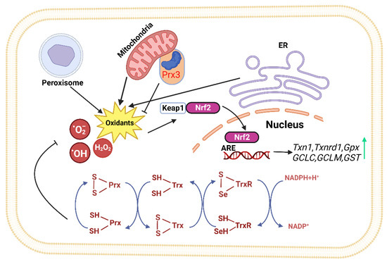 The thioredoxin system plays a crucial role in modulating cell viability and proliferation. Thioredoxin can donate electrons to various enzymes, including peroxiredoxins, which have critical roles in cell signaling by either removing hydrogen peroxide or regulating redox-sensitive signaling molecules [40,41,42,43,44,45]. The redox state of thioredoxin can affect the function of several transcription factors, making it an important player in cellular signaling [46,47,48,49]. (ER: Endoplasmic reticulum, Keap1: kelch like ECH associated protein 1, Nrf2: Nuclear factor erythroid 2-related factor 2, ARE: Antioxidant response element, TrxR: Thioredoxin Reductase, Trx: Thioredoxin, Prx: Peroxiredoxin, NADPH: Nicotinamide Adenine Dinucleotide Phosphate).