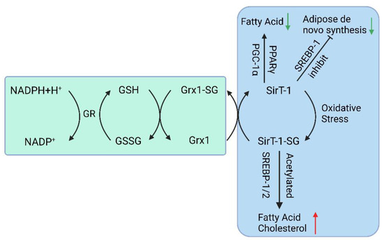Studies have shown that when Glrx1 KO mice are given a standard diet for some time, they develop obesity, hyperlipidemia, and fatty liver, resembling NAFLD. When fed a high-fat diet, Glrx1 KO mice develop fatty liver inflammation and progress to NASH [67]. In NAFLD animal models fed with a high-fat diet, S-glutathionylated protein levels increase, and an important target protein, Sirtuin-1 (SirT1), is identified. SirT1 is a NAD+-dependent class III histone deacetylase that regulates key transcription factors coordinating hepatic lipid metabolism [68,69,70]. Activation of SirT1 ameliorates Non-Alcoholic Fatty Liver (NAFL); conversely, hepatic SirT1 deficiency leads to steatosis [71], and thiol modification of SirT1 regulates lipid metabolism through acetylation of key transcription factors. S-glutathionylation inactivates SirT1 and promotes hyperacetylation and activation of downstream target proteins such as p53 and sterol regulatory element binding protein (SREBP) [68]. Activation of p53 is a cellular response to stress, resulting in the alteration of metabolism and the arrest of the cell cycle, and severe oxidative damage to hepatocytes may trigger p53 to induce cell death [72]. Studies also suggest that SirT1 overexpression can improve NAFLD [73], while Sirt1 knockout in mice leads to NAFLD (Figure 2) [74].