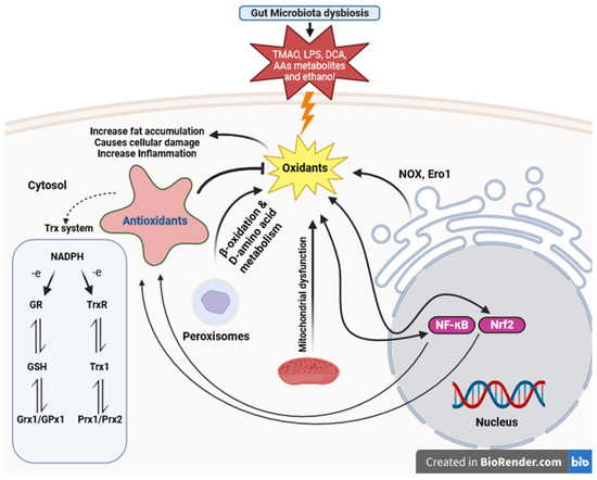 The development and progression of NAFLD are significantly influenced by the interplay between gut microbiota dysbiosis and thiol-redox system-mediated oxidative stress. By inducing dysbiosis, the gut barrier becomes disrupted, resulting in heightened permeability and the migration of harmful microbial products into the liver, consequently triggering inflammation and oxidative stress. The gut microbiota metabolites, such as TMAO, LPS, and SCFAs, contribute to liver inflammation, lipid accumulation, and insulin resistance. Elevated levels of TMAO and LPS contribute to oxidative stress, while SCFAs have anti-inflammatory and metabolic benefits in NAFLD. Additionally, ethanol and specific bacteria associated with alcohol production are linked to alterations in the gut microbiota, leading to oxidative stress and insulin resistance in NAFLD. Understanding the intricate relationship between gut microbiota dysbiosis and thiol-redox systems in NAFLD opens avenues for potential therapeutic strategies. Targeting both factors through interventions such as probiotics, prebiotics, dietary modifications, and antioxidant therapies may hold promise in preventing and treating NAFLD. Further research is necessary to unravel the precise mechanisms involved and identify novel therapeutic approaches to effectively manage this prevalent liver disease. By addressing both gut microbiota dysbiosis and oxidative stress, we can potentially mitigate the development and progression of NAFLD and improve patient outcomes.