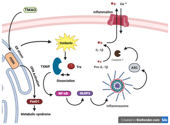 TMAO stimulates the transcription factor FoxO1, which is associated with metabolic disease, in the liver by interacting with the endoplasmic reticulum PKR-like eukaryotic initiation factor 2α kinase PERK (EIF2AK3), serving as a receptor. This interaction occurs through binding at physiological concentrations and specifically activating the unfolded protein response pathway (UPR) [132]. PERK serves as an ER stress sensor in eukaryotic cells, initiating an adaptive program that shapes the destiny of stressed cells by detecting unfolded proteins. Furthermore, PERK triggers NLRP3 inflammasome activation via the NF-κB pathway [133,134]. During ER stress, PERK sensors boost TXNIP transcription, hinder TXNIP mRNA breakdown by reducing miR-17, and thus modulate NLRP3 inflammasome activation [135,136]. An ER under stress leads to the buildup of oxidants, inducing oxidative stress [137]. In a study conducted by X. Sun et al., it was revealed that TMAO can trigger oxidative stress and activate the ROS-TXNIP-NLRP3 (NOD-like receptor protein 3) inflammasome signaling pathway in human umbilical vein endothelial cells (HUVECs) [138]. TXNIP operates through the NF-κB signaling pathway to activate the NLRP3 inflammasome [139]. TMAO exposure led to the production of ROS, which caused the disassociation of TXNIP from Trx and its binding to NLRP3 (Figure 4). This mediated the assembly of the NLRP3 inflammasome with Apoptosis-associated speck-like protein containing a CARD (ASC) and procaspase-1, leading to caspase-1-mediated conversion of pro-IL-1β to the activated form IL-1β. Ultimately, this led to the release of inflammatory cytokines and endothelial dysfunction [138].
