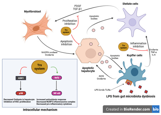 LPS-induced apoptosis is counteracted by Trx through the inhibition of ASK1 activation, a mediator of oxidants-induced cell death. In this process, Trx exhibits its antioxidant effects primarily in the cytosol, while the mitochondrial-specific Trx-2 is responsible for regulating apoptosis signaling pathways, collectively providing crucial protection against cell death caused by oxidants in distinct cellular compartments [151]. Further, Trx inhibits fibrosis by blocking the proliferation of HSC rather than directly blocking the apoptosis of hepatocytes. In addition, Trx has an inhibitory effect on HSC proliferation stimulated by serum and PDGF, which may be linked to its interaction with other signaling molecules or the inhibition of the p38 signal pathway in HSC (Figure 5) [152]. Xi Wang et al. investigated the role of Trx-2 in sepsis-induced liver damage [153]. They found that Trx-2 overexpression reduced inflammatory cytokine production, decreased neutrophil infiltration, and protected against liver injury in response to LPS stimulation. Moreover, decreased myeloperoxidase (MPO) activity and reduced levels of liver enzymes ALT and AST were observed, indicating a protective effect as a result of Trx-2 overexpression, ameliorating liver injury [153].