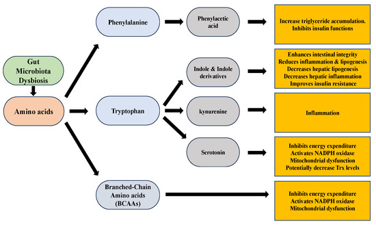 The gut microbiota actively metabolizes amino acids, including tryptophan, phenylalanine, and branched-chain amino acids (BCAAs), resulting in the production of metabolites that can significantly impact liver function in the development and progression of NAFLD (Figure 6). Tryptophan, an essential amino acid, serves as a precursor for multiple metabolites involved in NAFLD [181]. Indole, derived from tryptophan, enhances intestinal integrity and reduces inflammation and lipogenesis [182,183]. Indole-3-acetic acid, another derivative of indole, decreases hepatic lipogenesis inflammation and improves insulin resistance [184]. Serotonin, a neurotransmitter derived from tryptophan, when regulated by Thp1 (tryptophan hydroxylase 1, an enzyme in serotonin synthesis) and interacting with the HTR2a receptor (serotonin receptor 2a in the liver), plays a role in NAFLD by suppressing the energy expenditure of brown adipose tissue through inhibiting mitochondrial uncoupling protein 1 (UCP1) and promoting the accumulation of fat in the liver, known as hepatic steatosis [185,186]. A study done by Nocito et al. revealed that serotonin accumulation occurs in the liver primarily due to increased uptake by hepatic cells [119]. The study suggests that increased hepatic uptake of extracellular serotonin, possibly due to up-regulation of serotonin transporter (SERT), leads to its degradation by the enzyme MAO-A, generating oxidants that contribute to oxidative stress and liver damage in NASH. Oxidants are generated by the accumulated serotonin, which activates NADPH oxidase within HSCs. The increased levels of oxidants contribute to oxidative stress, which in turn impairs the normal functioning of mitochondria in HSCs. Mitochondria, the cellular powerhouses responsible for energy production, are particularly susceptible to oxidative damage [119]. There is not much research about Trx’s relation to serotonin in the liver context. However, levels and activity of the Trx in hippocampal cells were reported to be increased by chronic treatment with the antidepressants fluoxetine and venlafaxine. These drugs also inhibited protein cysteine sulfenylation induced by H2O2 and nitrosylation induced by the nitric oxide donor nitrosoglutathione. These findings suggest that Trx upregulation may potentially contribute to the protective effects of SSRIs and SNRIs against oxidative stress in depression [187]. Additional investigation is necessary to explore and modulate the potential correlation between Trx and serotonin in the context of the liver. The kynurenine pathway, also originating from tryptophan, is overactivated in NAFLD, leading to inflammation [182,184,185,188]. Phenylalanine and its derivative phenylacetic acid have been linked to hepatic steatosis by contributing to triglyceride accumulation and inhibiting insulin functions [120]. Furthermore, branched-chain amino acids (BCAAs) impair the tricarboxylic acid cycle and mitochondrial function, promoting insulin resistance and exacerbating NAFLD severity [189,190,191].