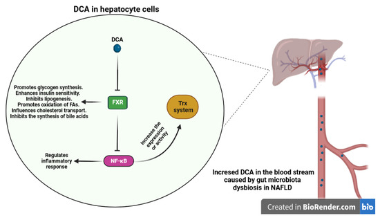 Na Jiao et al. conducted a study that revealed that NAFLD was linked to elevated levels of both primary and secondary bile acids in the bloodstream, resulting from the activity of the gut microbiota [198]. Specifically, the study revealed elevated concentrations of deoxycholic acid (DCA), which acts as an antagonist of FXR, and decreased levels of the agonistic bile acid chenodeoxycholic acid (CDCA) in NAFLD. In a study conducted by Masahiro Nomoto et al. [164], it was observed that Fxr-null mice exhibited significantly higher levels of oxidative stress markers, including 8-hydroxy-2′-deoxyguanosine (8OHdG), thiobarbituric acid-reactive substances (TBARS), and hydroperoxides, compared to wild-type mice. Furthermore, the expression of oxidative stress-related genes and the Nrf2 were upregulated in the livers of Fxr-null mice [199]. Also, Wang et al. discovered that FXR has the ability to inhibit NF-κB [200]. Thus, as discovered by Zhizhen Xu et al., it was found that administration of the FXR natural ligand, CDCA, in an animal model of LPS-induced liver injury could alleviate inflammatory damage to hepatocytes [201]. It has been reported that NF-κB may upregulate the expression or activity of two crucial cellular antioxidants, Trx1 and Trx2 [202,203]. Taken together, increased levels of DCA, an antagonist of FXR, and decreased levels of the agonisticCDCA in NAFLD can lead to antagonizing FXR signaling and activation of NF-κB, potentially impacting the thioredoxin antioxidant system (Figure 7).