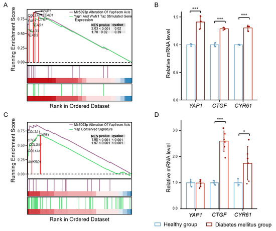 The expression of YAP signaling in diabetic HAECs and FVMs. (A) Normalized enrichment scores (NES) of the YAP-related pathway gene sets (|NES| > 1, p < 0.05) from Molecular Signatures Database (MsigDB) significantly enriched in HAECs of diabetic patients. (B) The relative expression levels of YAP target genes (CTGF and CYR61) in diabetic HAECs. (C) NES of the YAP-related pathway gene sets (|NES| > 1, p < 0.05) from MsigDB significantly enriched in diabetic retinopathy FVMs. (D) The relative expression of YAP target genes (CTGF and CYR61) in FVMs of patients with diabetic retinopathy. Data are means ± SD. * p < 0.05, *** p < 0.001.