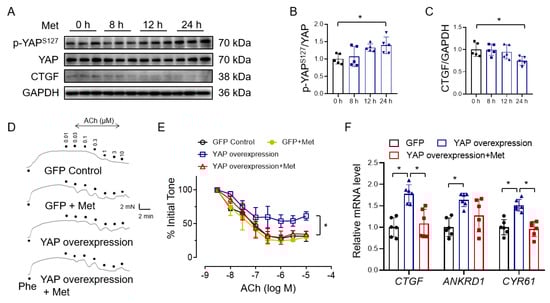 Metformin reverses YAP overexpression−induced endothelial dysfunction. (A) Representative immunoblots of YAP phosphorylation, total YAP, CTGF, and GAPDH in HUVECs treated with 10 mM metformin (Met) for 0, 8, 12, and 24 h. (B,C) Immunoblot quantification of YAP phosphorylation (B) and CTGF (C) in HUVECs. n = 5. (D) Representative traces. Ach: acetylcholine; Phe: phenylephrine. (E) ACh-induced endothelium-dependent relaxations in YAP−overexpressing aortas with or without metformin treatment. M: different concentrations of ACh (mol/L). n = 4. (F) Quantification of the mRNA expression of YAP target genes (CTGF, ANKRD1, and CYR61) in metformin−treated HUVECs after YAP overexpression. Data are means ± SD. * p < 0.05.