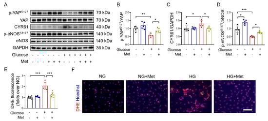 Metformin reverses high glucose-induced YAP activation in HUVECs. (A) Representative immunoblots of YAP phosphorylation, total YAP, CYR61, eNOS phosphorylation, total eNOS, and GAPDH in 30 mM glucose-treated HUVECs with and without co-treatment of 10 mM metformin. (B–D) Immunoblot quantification of YAP phosphorylation (B), CYR61 (C) and eNOS phosphorylation (D) in HUVECs. (E) Quantification of DHE fluorescence in HUVECs. (F) Representative images of DHE staining on ROS production in HUVECs. Bar = 200 μm. Met: metformin; NG: normal glucose; HG: high glucose. Data are means ± SD. * p < 0.05, ** p < 0.01, *** p < 0.001.