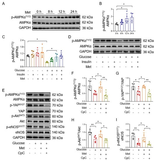AMPK inhibition reverses the beneficial effects of metformin. (A,B) Representative immunoblots (A) and quantification of AMPK phosphorylation (B) in HUVECs treated with 10 mM metformin (Met) for 0, 8, 12, and 24 h. (C,D) Quantification of AMPK phosphorylation (C) and representative immunoblots (D) in isolated mouse aortas treated with 30 mM glucose, 10 mM metformin, and 100 nM insulin. (E–I) Representative immunoblots (E) and quantification of AMPK phosphorylation (F), YAP phosphorylation (G), Akt phosphorylation (H), and eNOS phosphorylation (I) in HUVECs treated with 30 mM glucose, 10 mM metformin, and 10 μM AMPK inhibitor compound C (CpC). Data are means ± SD. * p < 0.05, ** p < 0.01.