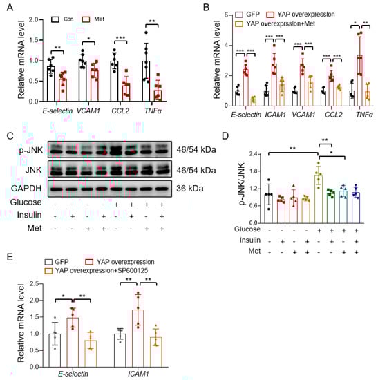 To confirm whether metformin protects endothelial function also through inhibiting the YAP-JNK-inflammation cascade, we treated HUVECs with metformin and determined the mRNA levels of pro-inflammatory genes by real-time PCR. The results showed that metformin suppressed the expression of pro-inflammatory genes, E-selectin, VCAM1, CCL2, and TNFα (Figure 6A). YAP overexpression increased the expression of E-selectin, ICAM1, VCAM1, CCL2, and TNFα, which was reversed by metformin treatment in HUVECs (Figure 6B). JNK is the main activated MAPK in response to inflammatory stress, which is associated with glucose intolerance in obese mice []. Metformin inhibited high glucose-induced JNK phosphorylation (Supplementary Materials, Figure S4A,B; Figure 6C,D). To test the role of JNK activation in YAP-induced inflammation, HUVECs were first infected with a plasmid overexpressing YAP and then treated with a JNK inhibitor, SP600125, for 4 h. The results showed that the JNK inhibitor reversed the YAP overexpression-induced expression of E-selectin and ICAM1 (Figure 6E). To substantiate that JNK is the downstream effector of YAP, we treated HUVECs with different concentrations of a JNK stimulator, phorbol 12-myristate 13-acetate (PMA), in the absence or presence of metformin and found that metformin failed to suppress PMA-induced expression of inflammation in HUVECs (Supplementary Materials, Figure S4C,D), thus suggesting that metformin reduces vascular inflammation through the inhibition of YAP without a direct effect on the JNK activity.