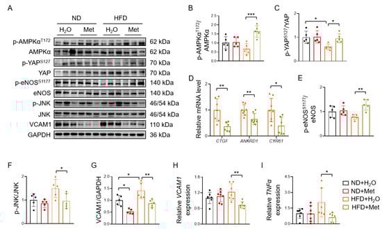 Metformin reverses HFD-induced YAP activation and vascular inflammation in mouse aortas. (A) Representative immunoblots of AMPK phosphorylation, total AMPK, YAP phosphorylation, total YAP, eNOS phosphorylation, total eNOS, JNK phosphorylation, total JNK, VCAM1, and GAPDH in isolated aortas from mice fed a normal diet (ND) or high-fat diet (HFD) and treated with 200 mg/kg/day metformin. (B,C) Immunoblot quantification of AMPK phosphorylation (B) and YAP phosphorylation (C). (D) Quantification of the mRNA expression of YAP target genes (CTGF, ANKRD1, and CYR61) in mouse aortas treated with HFD and metformin (Met). (E–G) Immunoblot quantification of eNOS phosphorylation (E), JNK phosphorylation (F), and VCAM1 (G) in isolated aortas from mice fed normal or high-fat diets and treated with 200 mg/kg/day metformin. (H,I) Quantification of the mRNA expression of pro-inflammatory genes, VCAM1 (H), and TNFα (I). Data are means ± SD. * p < 0.05, ** p < 0.01, *** p < 0.001.