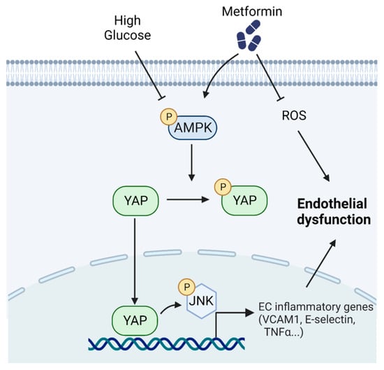 In this study, through mining and analyzing human vascular transcriptome data, we found the high glucose-induced activation of YAP in vascular endothelial cells and the increased expression of YAP target genes. The expression of the YAP target gene CTGF was significantly elevated, and the AMPK pathway was inhibited in diabetic pig aortic tissues, which was consistent with our findings in both the cell and animal experiments. Next, we examined whether metformin, as an activator of AMPK, can reverse the pathological process of high glucose-treated endothelial cells. Our results show that metformin-induced the phosphorylation of both AMPK and YAP in human endothelial cells, suggesting that YAP inhibition may be responsible for metformin-induced vascular beneficial effects. To reveal the role of YAP in endothelial function, we performed a functional assay on a wire myograph and showed that YAP overexpression impairs endothelial function reflected by diminished acetylcholine-induced endothelium-dependent relaxations. Metformin treatment ameliorated YAP overexpression-induced endothelial dysfunction and reversed the YAP overexpression-induced expression of YAP target genes. Metformin treatment decreased the high glucose-induced inhibition of AMPK phosphorylation, thus reversing high glucose-induced YAP activation. Furthermore, this effect of metformin was abolished by the AMPK inhibitor compound C. These new findings suggest that metformin inhibits YAP activity, likely through an AMPK-dependent mechanism, to protect endothelial function. The YAP–JNK cascade contributes to the pro-inflammatory action of YAP activation. We treated HUVECs with high glucose and found that the increased JNK phosphorylation was reversed by metformin. Meanwhile, metformin did not affect the expression of inflammatory genes induced by a JNK inducer PMA, thus suggesting that JNK is likely a downstream effector of YAP-induced inflammation. These results imply that metformin protects endothelial function by inducing YAP phosphorylation and subsequently inhibiting JNK-mediated inflammation via AMPK activation (Figure 8).