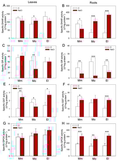 - Bela, K.; Riyazuddin, R.; Horváth, E.; Hurton, Á.; Gallé, Á.; Takács, Z.; Zsigmond, L.; Szabados, L.; Tari, I.; Csiszár, J. Comprehensive analysis of antioxidant mechanisms in Arabidopsis glutathione peroxidase-like mutants under salt- and osmotic stress reveals organ-specific significance of the AtGPXL’s activities. Environ. Exp. Bot. 2018, 150, 127–140. [Google Scholar]