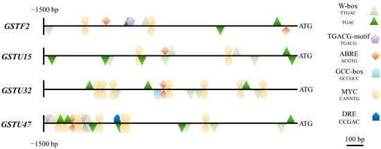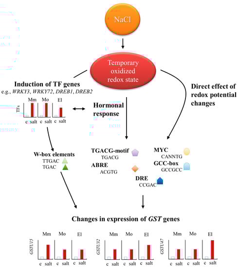 - Chen, J.-H.; Jiang, H.-W.; Hsieh, E.-J.; Chen, H.-Y.; Chien, C.-T.; Hsieh, H.-L.; Lin, T.-P. Drought and salt stress tolerance of an arabidopsis glutathione s-transferase U17 knockout mutant are attributed to the combined effect of glutathione and abscisic acid. Plant Physiol. 2012, 158, 340–351. [Google Scholar]