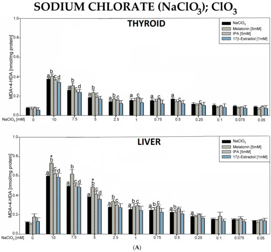 (A). Lipid peroxidation (LPO), measured as the level of malondialdehyde + 4-hydroxyalkenals (MDA + 4-HDA) in porcine thyroid or liver homogenates, incubated in the presence of sodium chlorate (NaClO3) (10.0, 7.5, 5.0, 2.5, 1.0, 0.75, 0.5, 0.25, 0.1, 0.075, and 0.05 mM) alone (black bars), or NaClO3 with melatonin (5 mM) (grey bars) or NaClO3 with indole-3-propionic acid (IPA) (5 mM) (striped bars) or NaClO3 with 17β-estradiol (1 mM) (dot bars). LPO level is expressed in nmol/mg protein. Data are presented as mean ± SE (error bars). a p < 0.05 vs. control (without any substance); b p < 0.05 vs. melatonin (5 mM); c p < 0.05 vs. indole-3-propionic acid (5 mM); d p < 0.05 vs. 17β-estradiol (1 mM); * p < 0.05 vs. NaClO3 in the same concentration. (B). Lipid peroxidation (LPO), measured as the level of malondialdehyde + 4-hydroxyalkenals (MDA + 4-HDA), in porcine thyroid (black bars) or liver (grey bars) homogenates. Homogenates were incubated in the presence of sodium chloride (NaClO3) (10.0, 7.5, 5.0, 2.5, 1.0, 0.75, 0.5, 0.25, 0.1, 0.075, and 0.05 mM) used to induce lipid peroxidation. LPO level is expressed in nmol/mg protein. Data are presented as mean ± SE (error bars). a p < 0.05 vs. control in the thyroid; b p < 0.05 vs. control in the liver; * p < 0.05 vs. NaClO3 in the same concentration in the other tissue.