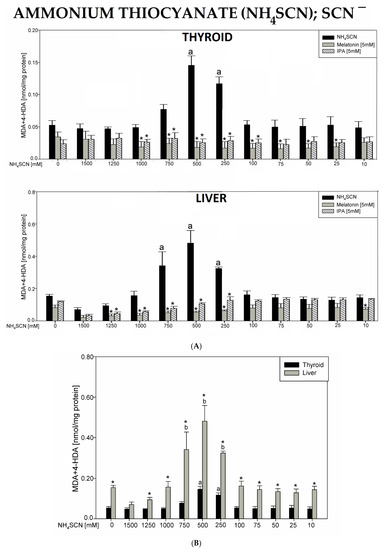(A). Lipid peroxidation (LPO), measured as the level of malondialdehyde + 4-hydroxyalkenals (MDA + 4-HDA) in porcine thyroid or liver homogenates, incubated in the presence of ammonium thiocyanate (NH4SCN) (1500, 1250, 1000, 750, 500, 250, 100, 75, 50, 25, and 10 mM) alone (black bars), or NH4SCN plus melatonin (5 mM) (grey bars) or NH4SCN plus indole-3-propionic acid (IPA) (5 mM) (striped bars). LPO level is expressed in nmol/mg protein. Data are presented as mean ± SE (error bars). a p < 0.05 vs. control (without any substance); * p < 0.05 vs. NH4SCN in the same concentration. (B). Lipid peroxidation (LPO), measured as the level of malondialdehyde + 4-hydroxyalkenals (MDA + 4-HDA) in porcine thyroid (black bars) or liver (grey bars) homogenates. Homogenates were incubated in the presence of ammonium thiocyanate (NH4SCN) (1500, 1250, 1000, 750, 500, 250, 100, 75, 50, 25, and 10 mM) used to induce lipid peroxidation. LPO level is expressed in nmol/mg protein. Data are presented as mean ± SE (error bars). a p < 0.05 vs. control in the thyroid; b p < 0.05 vs. control in the liver; * p < 0.05 vs. NH4SCN in the same concentration in the other tissue.