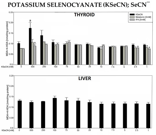 Potassium selenocyanate (KSeCN) increased lipid peroxidation only in the highest concentration of 500 mM and only in the thyroid. It is not excluded that the highest concentrations would be more damaging, but they were not achievable under in vitro conditions. Importantly, the increased LPO caused by KSeCN (500 mM) was completely prevented by melatonin and IPA.