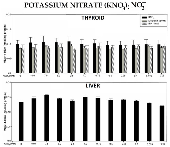 Lipid peroxidation (LPO), measured as the level of malondialdehyde + 4-hydroxyalkenals (MDA + 4-HDA) in porcine thyroid or liver homogenates, incubated in the presence of potassium nitrate (KNO3) (10.0, 7.5, 5.0, 2.5, 1.0, 0.75, 0.5, 0.25, 0.1 0.075, and 0.05 mM) or—in case of thyroid tissue—KNO3 plus melatonin (5 mM) (grey bars) or KNO3 plus indole-3-propionic acid (IPA) (5 mM) (striped bars). LPO level is expressed in nmol/mg protein. Data are presented as mean ± SE (error bars). No significant differences were found.