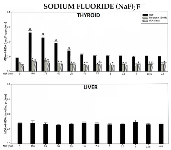 Lipid peroxidation (LPO), measured as the level of malondialdehyde + 4-hydroxyalkenals (MDA + 4-HDA) in porcine thyroid or liver homogenates, incubated in the presence of sodium fluoride (NaF) (100, 75, 50, 25, 10, 7.5, 5.0, 2.5, 1.0, 0.75, and 0.5 mM) alone (black bars), or—in case of thyroid tissue—NaF plus melatonin (5 mM) (grey bars) or NaF plus indole-3-propionic acid (IPA) (5 mM) (striped bars). LPO level is expressed in nmol/mg protein. Data are presented as mean ± SE (error bars). a p < 0.05 vs. control (without any substance); * p < 0.05 vs. NaF in the same concentration.