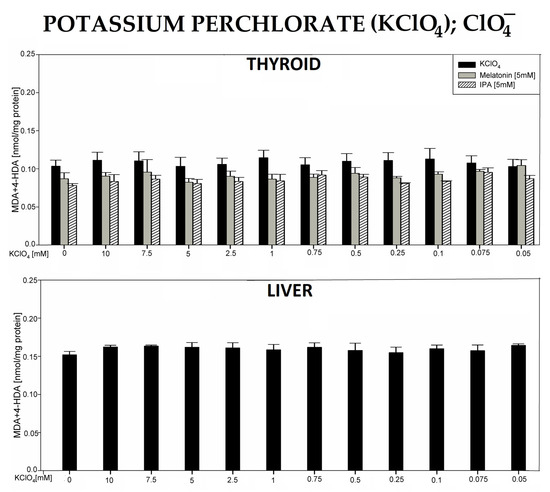 Lipid peroxidation (LPO), measured as the level of malondialdehyde + 4-hydroxyalkenals (MDA + 4-HDA), in porcine thyroid or liver homogenates, incubated in the presence of potassium perchlorate (KClO4) (10.0, 7.5, 5.0, 2.5, 1.0, 0.75, 0.5, 0.25, 0.1, 0.075, and 0.05 mM) or—in case of thyroid tissue—KClO4 plus melatonin (5 mM) (grey bars) or KClO4 plus indole-3-propionic acid (IPA) (5 mM) (striped bars). LPO level is expressed in nmol/mg protein. Data are presented as mean ± SE (error bars).