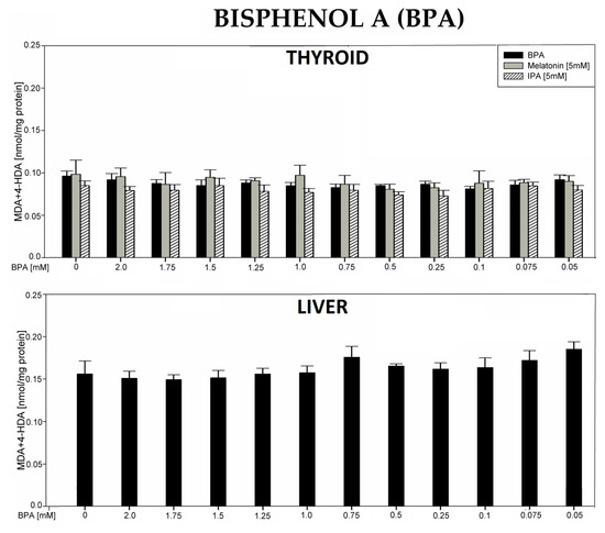 Lipid peroxidation (LPO), measured as the level of malondialdehyde + 4-hydroxyalkenals (MDA + 4-HDA) in porcine thyroid or liver homogenates, incubated in the presence of bisphenol A (BPA) (2.0, 1.75, 1.5, 1.25, 1.0, 0.75, 0.5, 0.25, 0.1, 0.075, and 0.05 mM) alone (black bars) or—in case of thyroid tissue—BPA plus melatonin (5 mM) (grey bars) or BPA plus indole-3-propionic acid (IPA) (5 mM) (striped bars). LPO level is expressed in nmol/mg protein. Data are presented as mean ± SE (error bars).