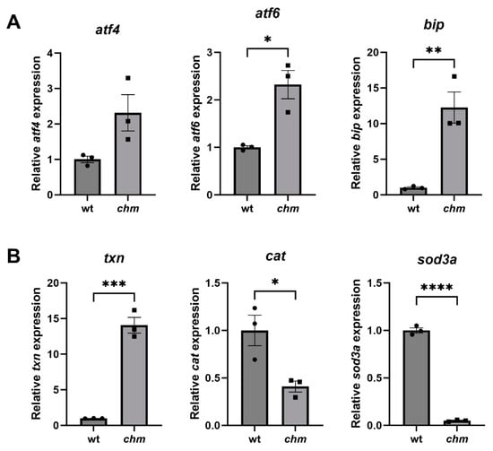 The expression of ER and oxidative stress markers was analysed using RT-qPCR in chmru848 zebrafish eyes at 5 dpf. The expression of the ER stress markers atf6, atf4 and bip was significantly increased in chmru848 fish by 2.3 (p = 0.0116), 2.3 and 12.3-fold (p = 0.0068), respectively, compared to the wildtype (wt) fish (Figure 1A). The expression of the oxidative stress markers cat and sod3a was significantly reduced by 2.4— (p = 0.0258) and 20.7-fold (p < 0.0001), respectively, compared to wt fish, and the expression of txn was significantly increased by 14.1-fold (p = 0.0003) in chmru848 fish (Figure 1B).