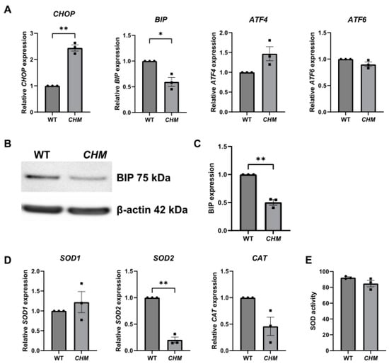 The expression of a number of ER- and oxidative-stress-related genes was analysed in CHMY42X patient fibroblasts. The ER stress marker BIP was significantly decreased (p = 0.0421) and CHOP was significantly increased (p = 0.0068) in CHMY42X patient fibroblasts compared to the WT cells (Figure 2A). Western blot analysis also revealed reduced BIP protein expression in CHMY42X fibroblasts, compared to the WT (p = 0.0094) (Figure 2B,C). The only oxidative stress marker that was found to be significantly reduced by 5-fold (p = 0.0048) was SOD2, compared to the WT fibroblasts (Figure 2D). A SOD activity assay was carried out; however, there was no difference in the overall SOD activity between the WT and CHMY42X fibroblasts (Figure 2E).