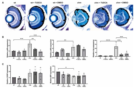 TUDCA is a bile acid commonly used to treat liver conditions and has been shown to possess ER-stress-lowering properties. TUDCA has been reported to slow retinal degeneration in various mouse models of retinitis pigmentosa (RP) [,,]. Zebrafish were treated with 20 µM TUDCA at 3 dpf and assessed at 5 dpf. Fish were also treated with an equivalent volume of DMSO as vehicle control. The retinal histology showed widespread retinal degeneration in chmru848 fish, including disrupted retinal lamination, areas of RPE atrophy and a small lens. Treatment with TUDCA did not result in any significant improvement in the retinal phenotype (Figure 3A). The ability of TUDCA to reduce the expression of ER stress markers in chmru848 fish was analysed using RT-qPCR, following TUDCA treatment. Although the expression of atf6 (p = 0.0037) and bip (p = 0.0001) was significantly reduced in TUDCA-treated chmru848 fish, these markers were also significantly reduced in DMSO-treated chmru848 fish (p = 0.0002 and p = 0.0003, respectively), indicating that this effect is due to DMSO (Figure 3B). Next, we evaluated the ER-stress-lowering properties of TUDCA in CHMY42X patient fibroblasts. Cells were treated with 100 µM of TUDCA or an equivalent volume of DMSO for 24 h, and the expression of CHOP and BIP was analysed using RT-qPCR; however, there was no significant reduction in ER stress in the TUDCA-treated cells (Figure 3C).