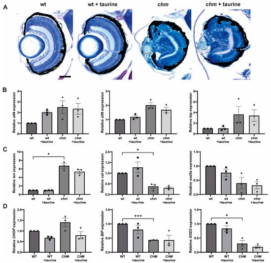 Analysis of ER stress in taurine-treated chmru848 fish and CHMY42X cells. Fish were treated with 100 mM of taurine at 3 dpf and collected at 5 dpf for (A) retinal histology and RT-qPCR analysis of (B) the ER stress markers atf6, bip and atf4 and (C) the oxidative stress markers txn, cat and sod3a. (D) Cells were treated with 100 mM of taurine and the expression of SOD2 and ER stress markers CHOP and BIP was analysed using RT-qPCR. Data are expressed as mean ± SEM from n = 3. * p ≤ 0.05, *** < p ≤ 0.001. Scale bar (50 μm), shown in wt corresponds to all images in panel.