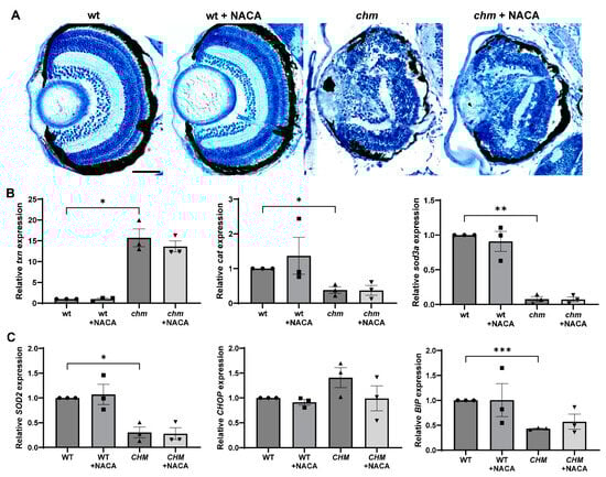 Analysis of oxidative stress in NACA-treated chmru848 fish and CHMY42X cells. Fish were treated with 200 µg/mL of NACA at 10 hpf and collected at 5 dpf for (A) retinal histology and (B) RT-qPCR analysis of the oxidative stress markers txn, cat and sod3a. (C) Cells were treated with either 1 mM of NACA, and the expression of SOD2 and the ER stress markers CHOP and BIP was analysed using RT-qPCR. Data are expressed as mean ± SEM from n = 3. * p ≤ 0.05, ** p ≤ 0.01, *** < p ≤ 0.001. Scale bar (50 μm), shown in wt corresponds to all images in panel.