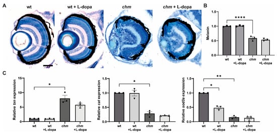 L-dopa is a melanin precursor and has been shown to rescue retinal development, morphology and visual function in a murine model of oculocutaneous albinism (OCA) []. L-dopa activates the G-protein-coupled receptor 143 (GPR143), which is highly expressed in the RPE []. Fish were treated with 1 mM of L-dopa at 3 dpf and the total melanin levels were quantified in whole embryos at 5 dpf. The melanin levels in chmru848 fish were significantly reduced to 59 ± 3.9%, compared to wt fish (p < 0.0001); however, treatment with L-dopa did not cause any significant change in melanin levels (Figure 6B). Retinal histology was also assessed at 5 dpf; however, no improvements in the retinal phenotype were detected in the treated fish (Figure 6A). Melanin plays a key role in protecting the RPE from oxidative stress; therefore, the expression of oxidative stress markers was also analysed following L-dopa treatment; however, L-dopa did not reduce oxidative stress in chmru848 fish (Figure 6C). L-dopa was not tested in patient fibroblasts, due to a lack of the expression of GPR143 in dermal fibroblasts.