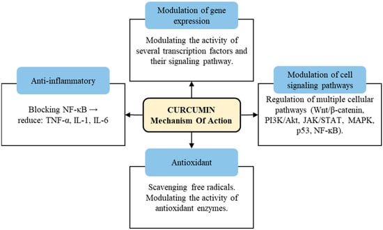 Curcumin also has been extensively studied for its potential biological activities and health benefits. Although curcumin’s effects are diverse and complex, some of its most notable biological activities include antimicrobial activity, anti-inflammatory activity, antioxidant activity and antinociceptive activity, in addition to serving as a wound-healing agent []. The mechanism of action of curcumin involves multiple pathways and molecular targets (Figure 2) [,,].