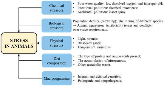 Stress encompasses the entirety of biological reactions to physical, emotional, or mental stimuli that disrupt an individual’s homeostasis. The causes and mechanisms of stress in animals can differ depending on the species and their specific environments. A stressor can be defined as any internal or external stimuli or threat that disrupts the body’s homeostasis and elicits a coordinated physiological response in an attempt to restore balance. There are different types of stressors that can intensify stress, including chemical stressors, biological stressors and physical stressors. Additionally, factors such as macroorganisms and diet composition can also contribute to stress levels [] (Figure 3).