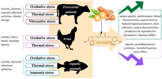 Stress management in the animal husbandry and aquaculture industries has been under serious consideration in recent times. Animal stress can arise from various factors, such as extreme cold or heat in the climate, insufficient nutrition (including lack of food or water), physiological disorders, and disease outbreaks []. These stressors have had a wide range of impacts on animals in general and livestock, poultry, and fisheries in particular, including effects on growth, production, reproduction, and disease susceptibility []. For instance, heat stress is one of the contributing factors to reduced milk yields and quality, decreased meat production, and fertility issues in farm animals []. Moreover, thermal stress also induces physiological, behavioral, and production changes in poultry [], as well as alterations in growth rate, oxidative stress, and immune response in fish []. As a result, animal stress has led to significant drawbacks in the agriculture sector and the nation’s economy. Thus, it is imperative to propose measures to address this issue. One potential solution that has garnered significant attention from scientists worldwide is the use of curcumin supplements to alleviate the deleterious effects of stress.