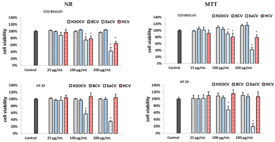 The cytotoxicity of the methanol water extract (ECV) and the n-hexane (HCV), ethyl acetate (EaCV), n-butanol (BCV), and water (H2OCV) fractions against human colorectal adenocarcinoma (HT29) was investigated using two complementary tests: neutral red (NR) and MTT. Normal human colon epithelial cells (CCD 841 CoTr) were used as a reference line. The results are presented in Figure 1 and Figure S1.