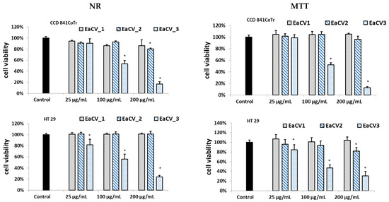 As can be seen, EaCV_3 exhibited significant cytotoxicity on both cell lines. However, for HT29, cytotoxicity was observed across all the tested concentration ranges. Conversely, the subfraction at 25 µg/mL did not have a negative effect on the CCD 841 CoTr. Cell viability remained above 94%, whereas in HT29, the number of viable cells decreased to approximately 80%.