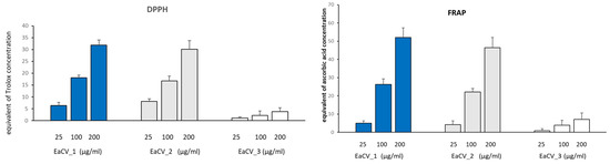 EaCV_1 and EaCV_2 exhibited similar free radical scavenging activity and ferric reducing ability. At a concentration of 100 µg/mL, their antioxidant potential was equivalent to 22–26 µg/mL ascorbic acid and 17–18 µg/mL Trolox. This suggests the presence of compounds with high antioxidant potential in these subfractions. On the other hand, EaCV_3 showed only a minor antioxidant effect.