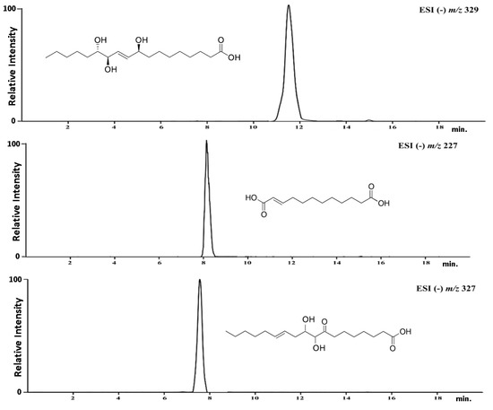 The isolation of the compounds was carried out using a semi-preparative HPLC system, with optimized chromatographic conditions. This yielded three compounds, namely pinellic acid, traumatic acid, and 9,10-dihydroxy-8-oxsooctadec-12-enic acid (Figure 4).