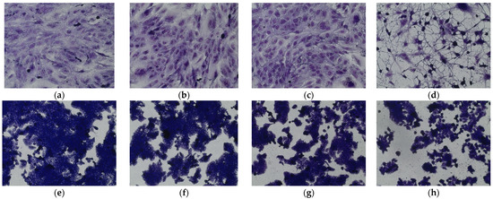 May–Grünwald–Giemsa (MGG) staining of (a–d) the normal human colon epithelial cell line (CCD 841 CoTr) and (e–h) human colorectal adenocarcinoma (HT29). Incubated with pinellic acid (b,f), traumatic acid (c,g), and 9,10-dihydroxy-8-oxsooctadec-12-enic acid (d,f) at a concentration of 200 µg/mL, control (a,e). Magnification 200×. Bar = 20 µm.