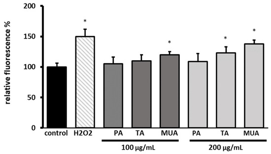 The antioxidant capacity studies indicated that the compounds do not possess free radical scavenging ability or the ability to reduce iron ions (Table S1). In fact, at a concentration of 200, both TA and MUA even increased intracellular ROS production (Figure 7).