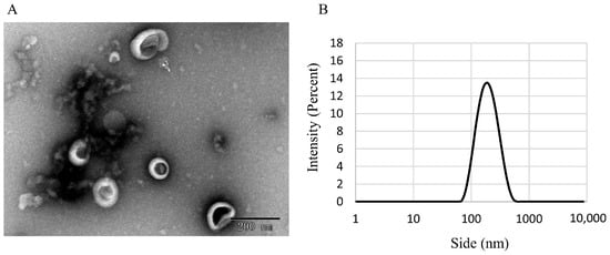 This experiment described that the CEVs were obtained from juice by using the PEG6000 polymer precipitation method, as shown in Figure 1A. The transmission electron microscopy image shows that the extracted CEVs are spherical vesicles of about 200 nanometers in size, with irregular shapes in the middle of the vesicles, which is consistent with the experimental results of a previous study [29]. Figure 1B confirms the size range of CEV particles to be approximately 60–500 nanometers through the analysis of the nanometer particle characteristics and zeta potential analyzer, with an average size of about 190 nanometers. In addition, the measured electric potential is approximately −5 Mv, and the PDI coefficient is approximately 0.17, indicating that the distribution of CEVs is relatively narrow and has good singularity.