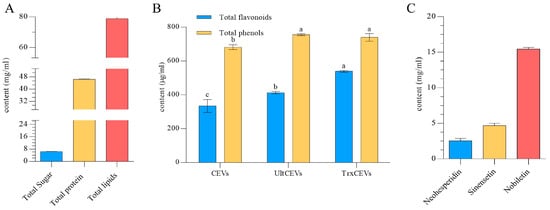 Determination of the chemical composition contents of CEVs. Determination of total sugar content, total lipids, and total protein content of CEVs (A); the total phenol and total flavonoid contents in CEVs were determined both by themselves as well as by ultrasonic deconstruction and chemical deconstruction (B); types and contents of flavonoids detected in CEVs (C). Values in the same row with different superscript letters are significantly different (p < 0.05).